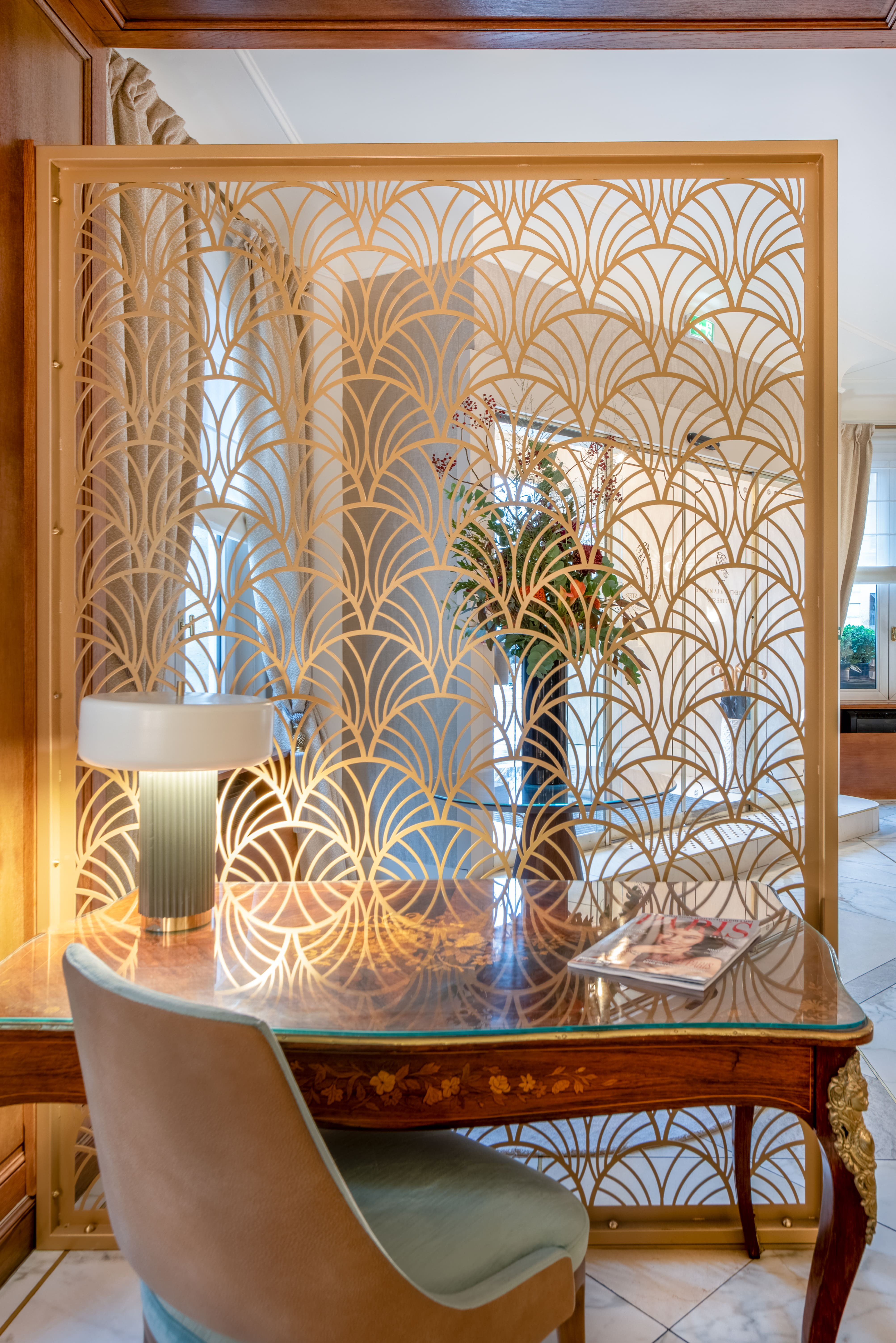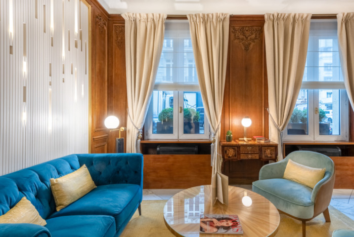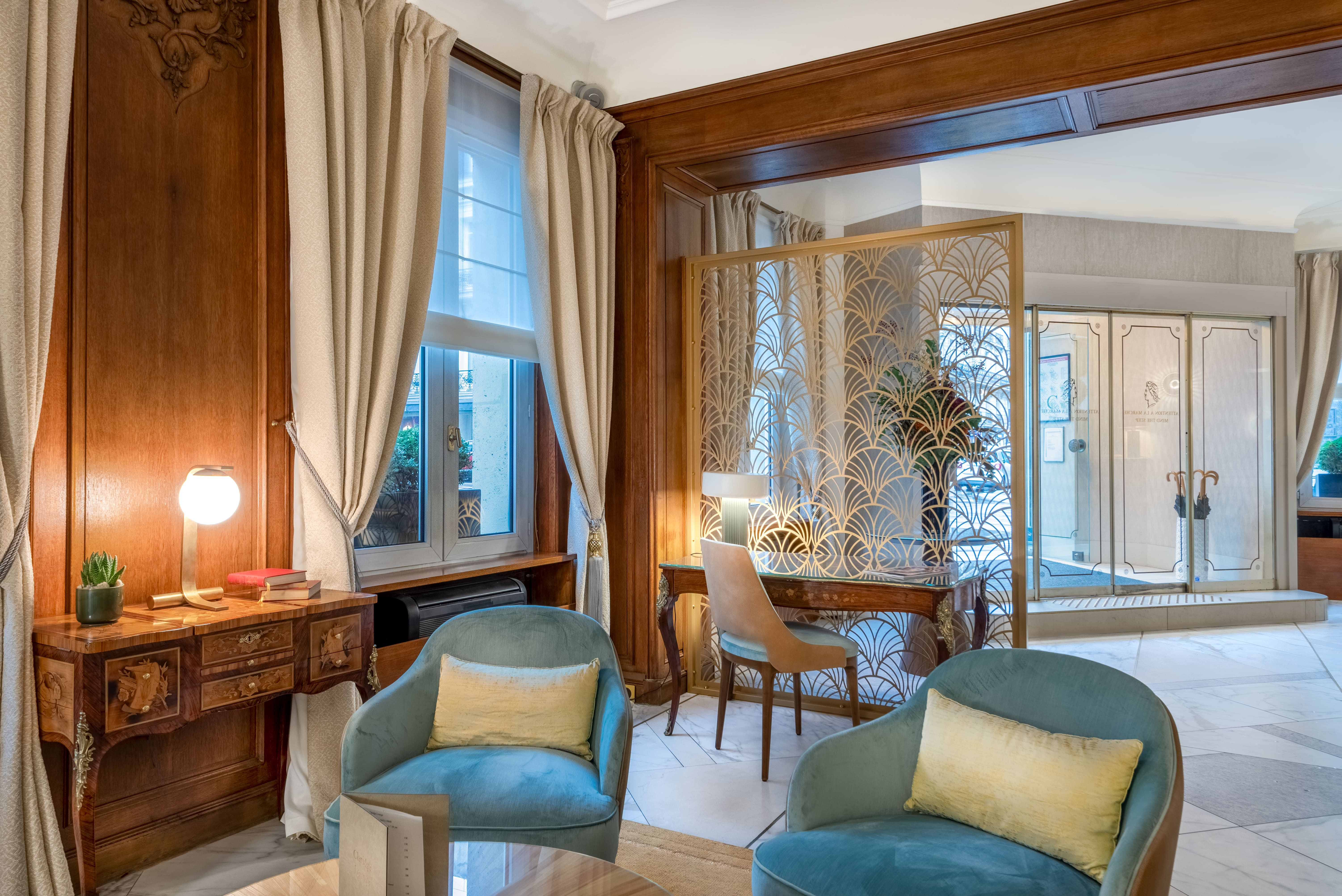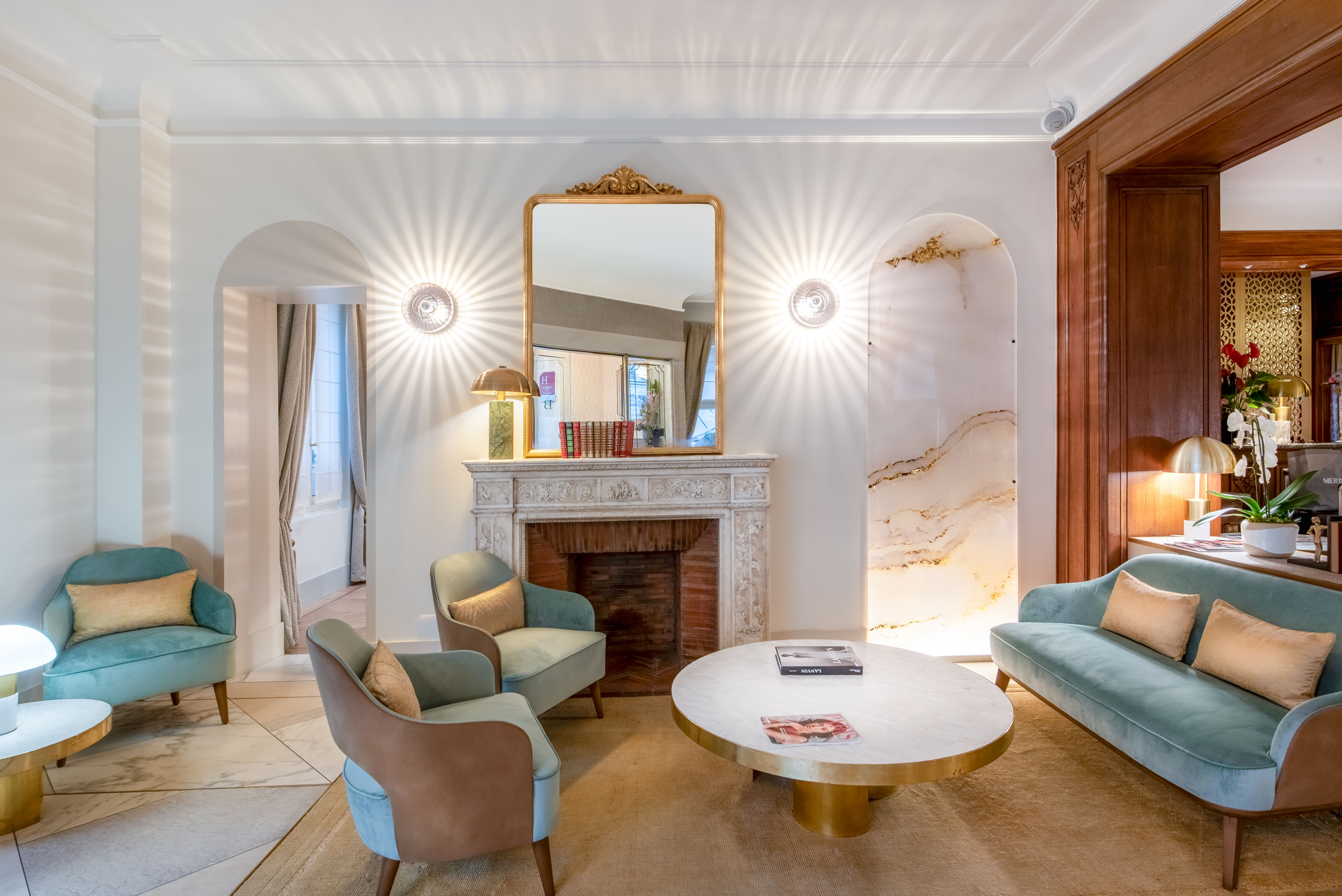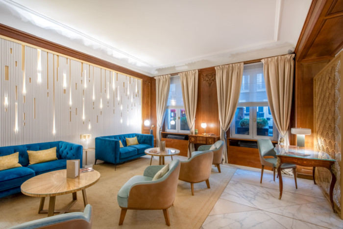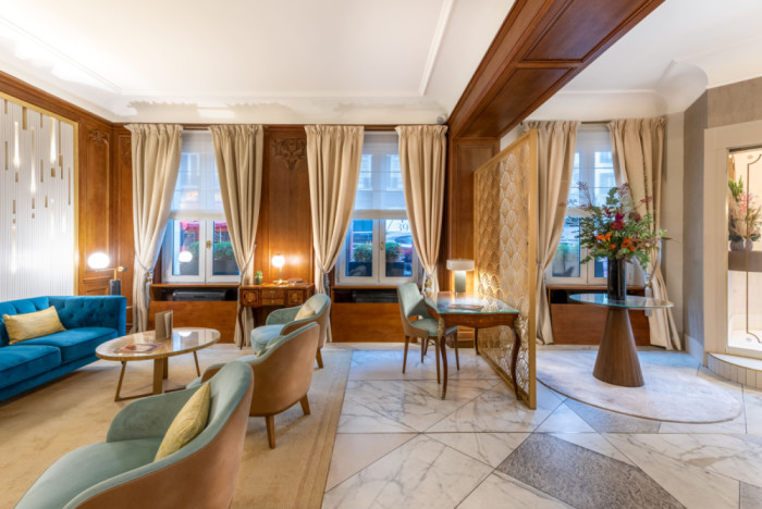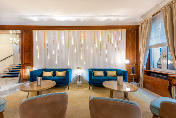 Le lobby s’articule autour de deux zones. La première, autour des canapés, est marquée par un mur lumineux associant des tasseaux de bois et une plaque de laiton rétroéclairée. La lumière traverse les interstices et crée une trame régulière qui installe rythme et profondeur. Les canapés en velours bleu s’inscrivent sur un parquet point de Hongrie, ponctué de tapis en laine encastrés. En vis-à-vis, un espace cheminée avec des fauteuils définit une ambiance plus intime. La réception conserve son comptoir en bois massif, mis en valeur par un claustrât en laiton conçu sur mesure.