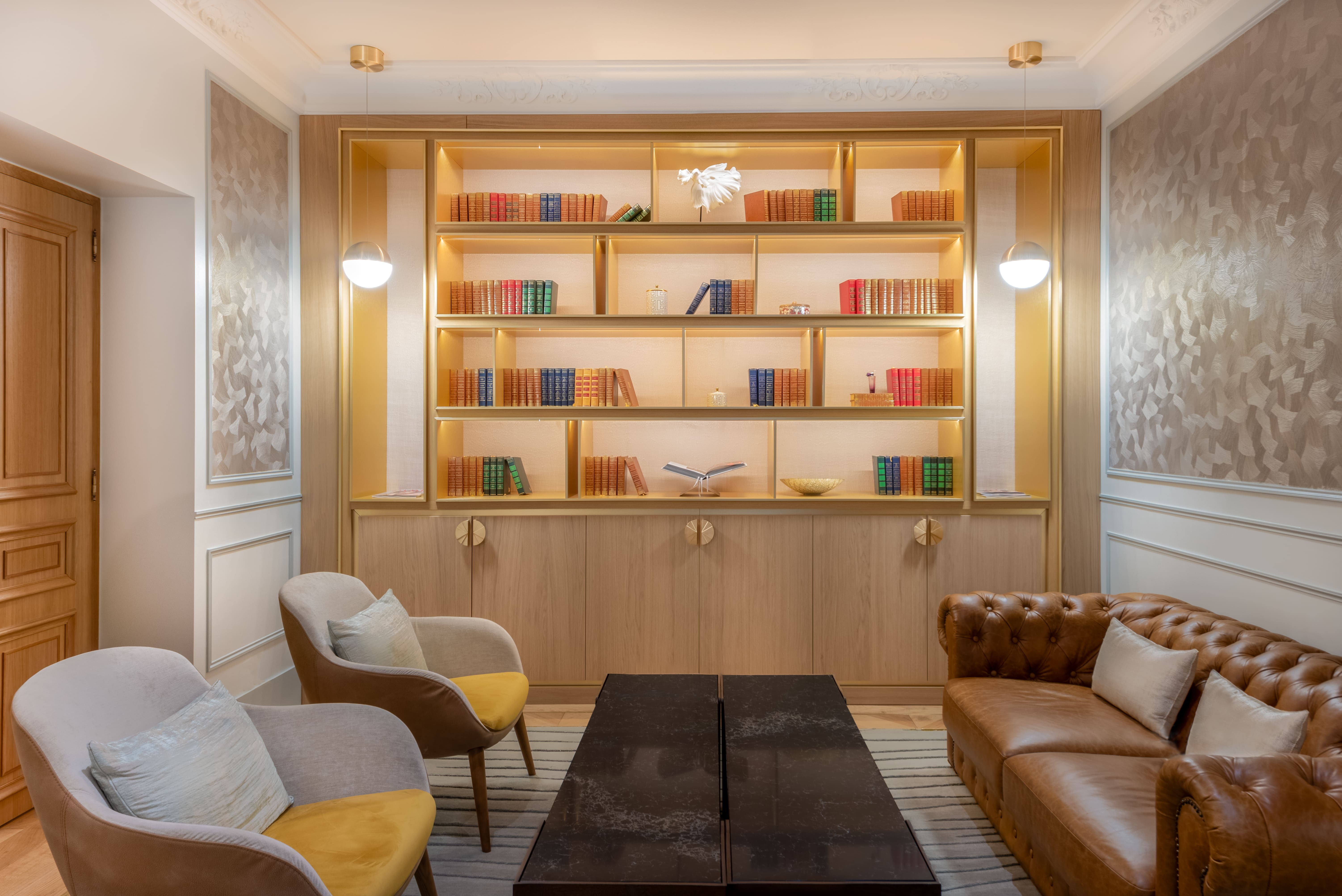 Le petit salon se structure autour d’une bibliothèque réalisée sur mesure. Les étagères en laiton rétroéclairées diffusent une lumière douce et donnent de la profondeur. Elles dialoguent avec un placage chêne et un fond clair texturé qui rappelle l’écorce. Des niches verticales accueillent des suspensions. Les portes basses, soulignées par un cadre en laiton et des poignées demi-lune striées, rappellent l’esprit art déco de l’hôtel. Le parquet point de Hongrie et les tapis encastrés prolongent le vocabulaire du lobby.