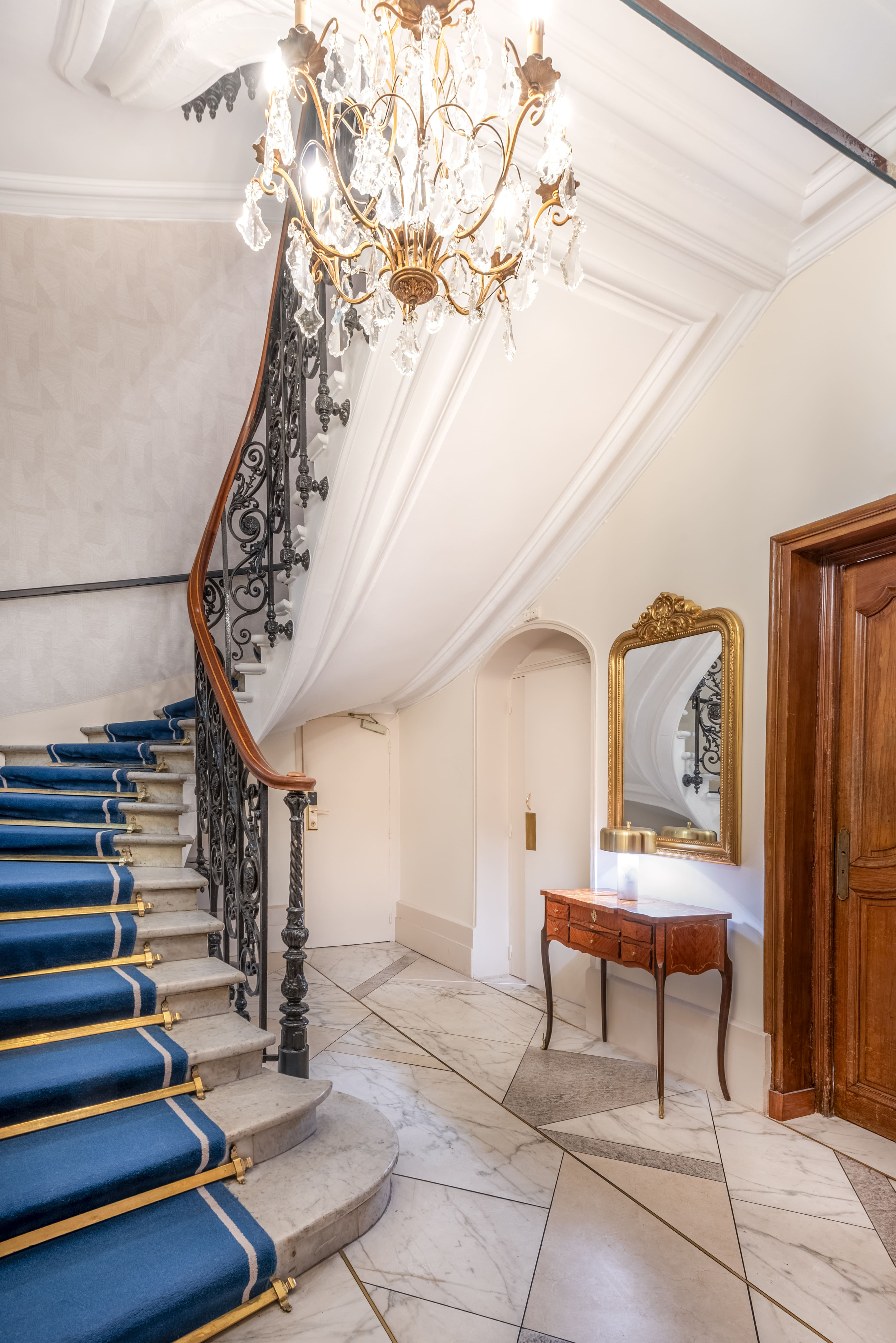 Le sas d’entrée a été retravaillé dans son traitement décoratif. Par le choix des matériaux et de la finition, il s’inscrit désormais comme un prolongement du lobby, et non plus comme un espace technique séparé. Les murs plus clairs apportent de la luminosité. Le sol en marqueterie de carrelage, composé de quatre typologies différentes, introduit un motif géométrique qui accompagne la circulation.